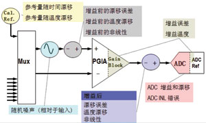 相對(duì)而言,精度的概念是指測量值與“真實(shí)”值之間的最大偏差的絕對(duì)值。如圖1所示,信號(hào)在整個(gè)數(shù)據(jù)采集系統(tǒng)中會(huì)受到參考量隨時(shí)間、溫度的飄移誤差、隨機(jī)誤差、非線性誤差、增益誤差等影響,這些影響綜合之后對(duì)測量結(jié)果所產(chǎn)生的影響就是我們所說的測量精度。