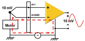 接地環(huán)路會(huì)嚴(yán)重影響測試結(jié)果,例如,在圖4所示的電路中,為了能夠長時(shí)間監(jiān)測一個(gè)電機(jī)的溫度,在電機(jī)上連上一個(gè)熱電偶傳感器,由于電機(jī)箱是接地的,因此熱電偶也接地,而數(shù)據(jù)采集設(shè)備地與電機(jī)箱地之間存在電勢差,因此產(chǎn)生了電流。你可以注意到,加在測試信號(hào)的噪聲可能是交流的,或者一個(gè)簡單的直流偏移值,但最終無可避免地影響了測試精度。