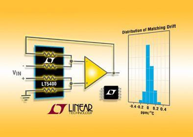 凌力爾特公司(Linear Technology Corporation)推出公司第一個(gè)精確匹配的電阻器網(wǎng)絡(luò)器件系列LT5400,該系列器件為差分放大器、精準(zhǔn)分壓器、基準(zhǔn)和橋式電路中的高性能信號調(diào)理應(yīng)用而設(shè)計(jì)。三款可選版本已全面投產(chǎn),分別是電阻比率為1:1和10:1的四個(gè)10K電阻、四個(gè)100K電阻和兩個(gè)10K/兩個(gè)100K電阻。每款LT5400系列器件在-40℃至85℃的溫度范圍內(nèi)提供了0.01%的保證匹配準(zhǔn)確度,而在-40℃至125℃則提供 0.0125%。LT5400的匹配性能利用“CMRR 匹配”得以增強(qiáng),這是在采用差分放大器電路配置時(shí)用于保證CMRR性能的一種新度量標(biāo)準(zhǔn)。LT5400的CMRR匹配誤差僅為0.005%,比采用獨(dú)立電阻器時(shí)的0.01%匹配誤差改進(jìn)了2倍。