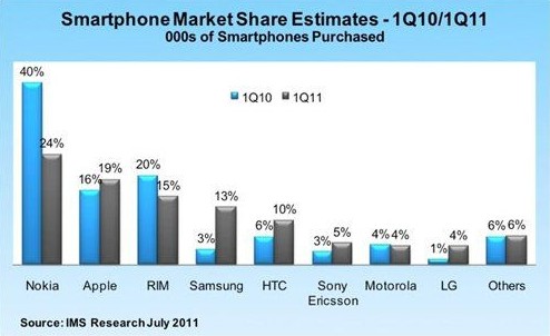 市場研究公司IMS Research表示,在傳統(tǒng)手機(jī)市場,三星近年來的表現(xiàn)最為突出。該公司擁有多元化的產(chǎn)品組合,包括使用其自身操作系統(tǒng)bada以及Android和 Windows Mobile操作系統(tǒng)的產(chǎn)品,也包括廣受歡迎的Galaxy系列產(chǎn)品。該公司在智能手機(jī)市場的份額從2010年第一季度的3%左右一舉升至2011年第一 季度的13%以上。與此同時,HTC等智能手機(jī)廠商的市場份額也大幅上升。