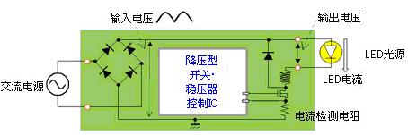 羅姆為了適應(yīng)上述市場需求而在進(jìn)行LED照明用驅(qū)動器IC的開發(fā)。為使LED保持一定的亮度點(diǎn)燈,需要有進(jìn)行恒流控制的LED驅(qū)動器IC。通常,是從交流電源開始進(jìn)行恒流控制,所以使用降壓型開關(guān)穩(wěn)壓器方式(圖1)。