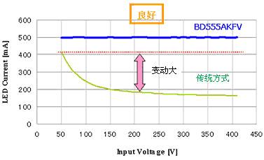 為了防止出現(xiàn)這種閃爍現(xiàn)象,需要有能夠確保保持電流恒定的泄放電路,各制造廠商采用各種各樣的方式構(gòu)成泄放電路。BD555AKFV內(nèi)置有羅姆獨(dú)創(chuàng)的泄放電路,采取了避免無謂損失的措施。