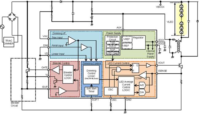 作為LED照明,它需要有能夠驅(qū)動從燈泡等小型照明的小功率產(chǎn)品到路燈等大型照明的大功率產(chǎn)品電源。而且,這種電源應(yīng)當(dāng)與原有照明器具所使用的“可控硅調(diào)光”、LED照明專用的“PWM調(diào)光”以及可以用體電阻調(diào)光的“線性調(diào)光”等多種調(diào)光方式兼容。