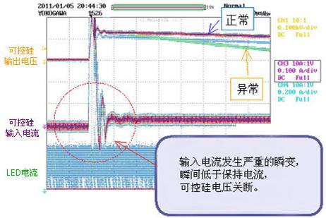 可控硅調(diào)光器在可控硅處于導(dǎo)通狀態(tài)時(shí)必須使保持電流持續(xù)流通;一旦保持電流下降,可控硅便關(guān)斷了。由于LED照明燈與原有照明燈相比,功耗極低,所以使可控硅的保持電流下降,調(diào)光器就往往會因此而不定期關(guān)斷從而發(fā)生閃變(閃爍)現(xiàn)象。(圖5)