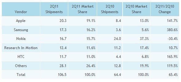 由于Galaxy S智慧手機系列產品熱銷,較去年成長了381%,市占率為16.2%。諾基亞第二季銷售量與市占率(15.7%)雙雙下滑,出貨量更跌落新低,首次滑落至2000萬支以下,僅有1670萬支。不過值得注意的是,宏達電市占率從上一季6.8%上升第二季的11%。IDC表示宏達電的成功主要歸因于推出多種新手機,且它的3D熒幕與4G速度的機型證明宏達電具有推出前瞻性技術的能力。至于RIM今年推出的新機型不多,因此,今年出貨量大部份以價格價低的舊機種為主,市占率下跌至11.6%。