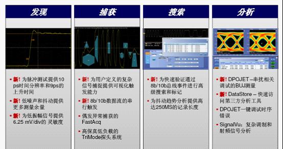 圖4:從發(fā)現(xiàn)、捕獲到搜索、分析,DPO/DSA70000D系列33GHz示波器囊括了多個行業(yè)第一和關(guān)鍵創(chuàng)新點。