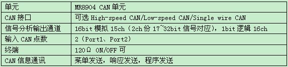 使用MR8904單元,可測量CAN格式數(shù)據(jù),在汽車研發(fā)現(xiàn)場非常實(shí)用。(所謂CAN,即“Controller Area Network”,是獲取汽車引擎轉(zhuǎn)數(shù)、輪胎壓等數(shù)據(jù)的方式。)