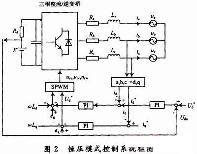 在對機車蓄電池充電時,為了快速充電同時延長電池的使用壽命,將充電與放電過程分成不同的階段,可以視具體情況分階段選擇恒流或者恒壓模式充放電。恒壓充放電模式采用電壓定向控制模式,控制框圖如圖2所示??刂撇呗圆捎秒p閉環(huán)結構,外環(huán)控制直流電壓,內環(huán)控制電流。電流內環(huán)作用是提高系統(tǒng)的動態(tài)性能和實現(xiàn)限流保護,電壓外環(huán)的作用是保證直流側電壓的穩(wěn)定性。直流輸出電壓給定信號和實際直流電壓Vdc比較后的誤差信號送入P1調節(jié)器,PI調節(jié)器的輸出即為主電路交流輸入參考電流的幅值,比較得到電流誤差后,對電流誤差進行PI調節(jié),用以減緩電流在動態(tài)過程中的突變。然后再與輸入電壓的空間矢量進行比較控制,最后通過SPWM調制算法即可生成相應6路驅動脈沖控制三相整流橋IGBT的通斷,間接地控制網側電流,實現(xiàn)網側功率因素的調節(jié)。
