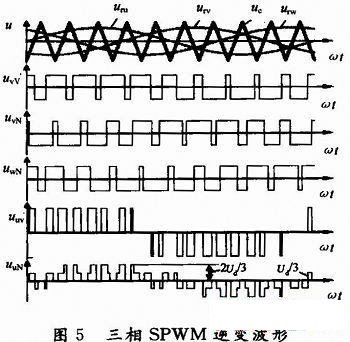 本文采用SPWM調制方式。圖2中,三相調制信號uru、urv和urw為相位依次相差120°的正弦波。a,b,c相自關斷開關器件的控制方法相同,現(xiàn)以a相為例:在uru>uc的各區(qū)間,給上橋臂電力晶體管V1以導通驅動信號,而給下橋臂V4以關斷信號。在uru<uc的各區(qū)間,給V1以關斷信號,V4以導通信號。圖5是三相橋式PWM逆變電路輸出三相對于負載中性點N的相電壓波形。