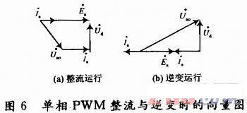 圖6是a相在整流運行、逆變運行時的相量圖。在SPWM調制方式下,電網電壓ua與ua產生的基波分量uao為正弦波,流過電感La的電流也為正弦波。圖6所示,從a相電路的相量圖可以很容易地看出,三相電壓源型PWM雙向變流器可以實現(xiàn)單位功率因數(shù)運行。