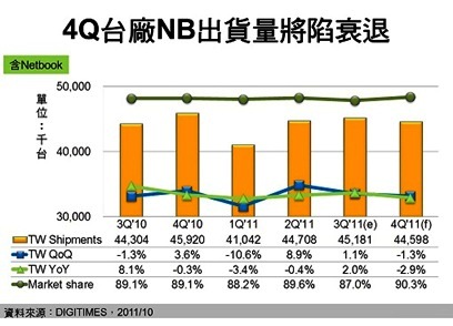 9月部分品牌NB出貨雖見回溫,但主因是庫存過低回補,非因市場需求回升所致。簡佩萍預(yù)估,第三季的低迷市況,將延續(xù)至第四季,年成長率也將再度陷入衰退。而因惠普訂單從偉創(chuàng)力回流至臺廠,雖使得第四季臺廠占全球NB出貨量比重提升至90.3%,但2011年臺廠將僅有第三季的NB出貨量年成長率為正。