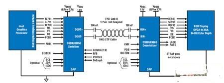 一旦接收器PLL鎖定在發(fā)射器的頻率下,即可由LOCK輸出標志引腳顯示這一狀態(tài),確保接收器輸出的數(shù)據(jù)完整性。DS90UR907/8芯片組具有DS90UR905/6芯片組的一切特性,兩耳區(qū)別在于輸入輸出不再是發(fā)送LVCMOS信號的并行總線,而是遵照開放的工業(yè)標準"FPD-Link"。很多現(xiàn)代化的圖像控制器、顯示定時控制器、ASIC和FPGA都支持這種"一級串行化"技術,它采用適合18bpp的3個數(shù)據(jù)通道,或者適合24bpp的4個數(shù)據(jù)通道,每一個都有一路并行時鐘通道。電信號的發(fā)送遵循開放的ANSI/TIA/EIA-644A標準,該標準又稱作"LVDS"(低壓差分信號傳輸)。使用該接口技術代替常規(guī)LVCMOS的優(yōu)勢在于:采用差分信號可降低電磁干擾,并減少組件的引腳數(shù)量,如圖3所示。