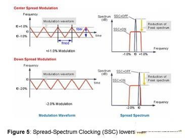 解串器通過一塊集成可配置的擴頻時鐘(SSC)生成器得到增強。在接收器輸出總線端,這會導致輸出時鐘頻率和數(shù)據(jù)頻譜隨著時間推移而以幾十KHz的低調(diào)制率產(chǎn)生輕微變化。如圖5所示,頻率變化可以發(fā)生在名義像素時鐘中心頻率附近("中心擴頻調(diào)制"),或朝向更低的頻率("向下擴頻調(diào)制")。頻譜擴展百分比可高達±2%。擴頻時鐘將峰值能量分散在更寬的頻譜范圍內(nèi),從而大大降低了電磁干擾噪聲水平,而不是在同一時間點上、以恒定頻率來轉(zhuǎn)換所有輸出,此時的輻射噪聲集中在一個窄頻段內(nèi),所有輸出數(shù)據(jù)都與輸出時鐘同步,這使得數(shù)據(jù)和時鐘得到有效擴展。特別是DS90UR906接收器輸出具有低壓(LV)CMOS接口選項,可以大大降低電磁輻射。