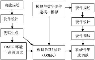 汽車電子產(chǎn)品是軟硬件結(jié)合的嵌入式系統(tǒng)。為了節(jié)約資源,縮短產(chǎn)品開發(fā)周期,一般應(yīng)采取軟硬件同步開發(fā)的方案。汽車電子產(chǎn)品的開發(fā)工具對(duì)軟硬件的同步開發(fā)、調(diào)試提供了很好的支持。汽車電子產(chǎn)品的軟件開發(fā)分為功能描述、軟件設(shè)計(jì)、代碼生成、操作系統(tǒng)環(huán)境下高級(jí)調(diào)試等步驟。汽車電子產(chǎn)品的硬件開發(fā)分為硬件描述、硬件設(shè)計(jì)、硬件調(diào)試等步驟。當(dāng)軟件設(shè)計(jì)完成后,通過(guò)使用相應(yīng)的工具,完成在虛擬ECU平臺(tái)上的驗(yàn)證。當(dāng)硬件設(shè)計(jì)完成后,與硬件一起進(jìn)行軟硬件集成調(diào)試。通過(guò)這種開發(fā)方式,縮短了產(chǎn)品上市的時(shí)間。