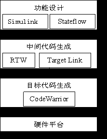 在進(jìn)行向標(biāo)準(zhǔn) C代碼的轉(zhuǎn)換的過(guò)程中,可以根據(jù)需要加入符合OSEK規(guī)范的嵌入式實(shí)時(shí)操作系統(tǒng)。在代碼生產(chǎn)階段使用的主要工具是CodeWarrior。通過(guò)使用CodeWarrior提供的編譯器、調(diào)試器等工具,完成從標(biāo)準(zhǔn)C代碼向目標(biāo)硬件平臺(tái)上的產(chǎn)品代碼的轉(zhuǎn)換工作。下圖表示了汽車電子產(chǎn)品的代碼生成過(guò)程。