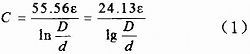 式中:C為電纜單位長度電容(pF/m);ε為絕緣介質(zhì)的相對介電常數(shù);D為電纜的外導(dǎo)體內(nèi)徑即絕緣層外徑(mm);d為電纜的內(nèi)導(dǎo)體外徑(mm)。