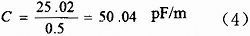 設(shè)樣品浸入水中的長度為500mm,電容測試儀顯示值為25.02pF,就可以測得單位長度電容為: