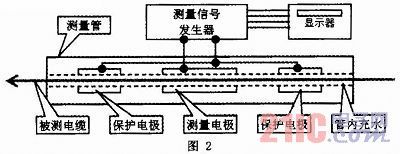 水電容測試儀由測量管、測量信號發(fā)生器、顯示器等組成(見圖2)。測量信號發(fā)生器產(chǎn)生的正弦波交流電壓同時加到浸沒于水中的測量管中的測量電極和保護(hù)電極,測量電極上的電流通過被測電纜的電容流回電源地線,在信號源電壓和頻率固定時,流過電容的電流與電容量大小成正比。