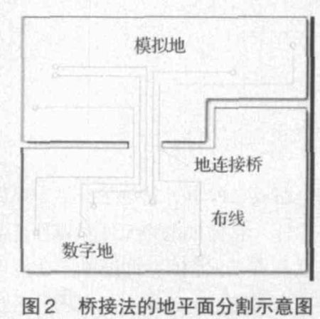 了解電流回流到地的路徑和方式是優(yōu)化混合信號電路板設(shè)計的關(guān)鍵。如果必須對地線層進行分割,而且必須通過分割之間的間隙布線,可以先在被分割的地之間進行單點連接,形成兩個地之間的連接橋,然后通過該連接橋布線,如圖2 所示。