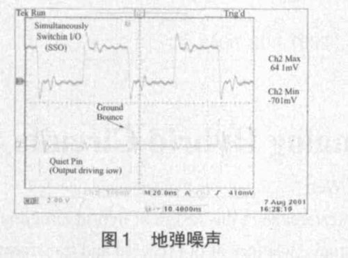 模擬信號與數(shù)字信號相比,對噪聲的敏感程度要大得多,因為模擬電路的工作依賴連續(xù)變化的電流和電壓,任何微小的干擾都能影響它的正常工作,而數(shù)字電路的工作依賴在接收端根據(jù)預(yù)先定義的電壓電平或門限對高電平或低電平的檢測,具有一定的抗干擾能力。但在混合信號環(huán)境中,數(shù)字信號相對模擬信號而言是一種噪聲源。數(shù)字電路工作時,穩(wěn)定的有效電壓只有高低電平兩種電壓。當(dāng)數(shù)字邏輯輸出由高電壓變?yōu)榈碗妷?,該器件的接地管腳就會放電,產(chǎn)生開關(guān)電流,這就是電路的開關(guān)動作。數(shù)字電路的速度越快,其開關(guān)時間一般也要求越短,當(dāng)大量的開關(guān)電路同時由邏輯高電平變?yōu)檫壿嫷碗娖綍r,由于地線通過電流的能力不夠,大量的開關(guān)電流就會引起邏輯地電壓發(fā)生波動,我們稱為地彈。如圖1 所示。數(shù)字電路造成的地彈噪聲和電源擾動,如果耦合到模擬電路中,就會影響模擬電路的工作性能。由于相當(dāng)多的干擾源是通過電源和地總線產(chǎn)生的,其中地線引起的噪聲干擾最大,所以在PCB 設(shè)計時對地和電源的設(shè)計就顯得尤為重要。