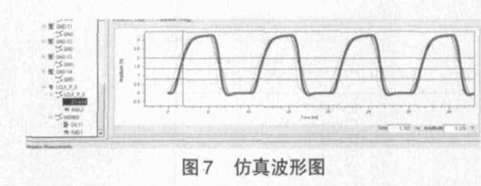 此印制板上100M 的時鐘信號線經(jīng)過設(shè)計軟件仿真分析,如圖7 所示,信號傳輸基本沒有受到干擾,達到電訊要求。生產(chǎn)的印制板經(jīng)過調(diào)試顯示,數(shù)字信號對模擬信號的干擾很小,參數(shù)指標(biāo)良好。