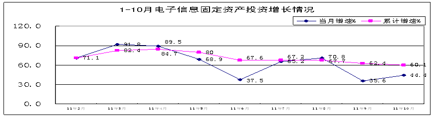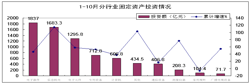 今年1-10月,電子信息產(chǎn)業(yè)固定資產(chǎn)投資持續(xù)高速增長(zhǎng),500萬元以上項(xiàng)目完成固定資產(chǎn)投資7361億元,同比增長(zhǎng)60.1%,增速高于工業(yè)投資33.5個(gè)百分點(diǎn)。但從9月份開始,投資增速開始回落,9、10月份分別同比增長(zhǎng)35.6%和44.4%,增速低于8月份(70.8%)35.2和26.4個(gè)百分點(diǎn),同時(shí)10月份完成投資869.5億元,環(huán)比下降2.3%。