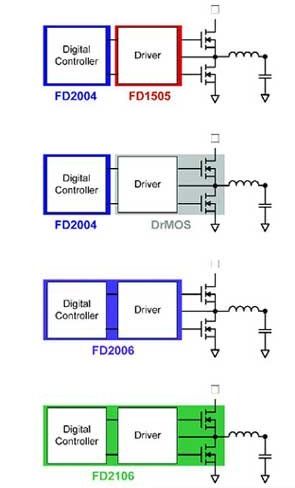FD2004可以與外部柵極驅(qū)動器 (如FD1505) 和分立式MOSFET ,或是集成了驅(qū)動器與MOSFET的單封裝DrMOS產(chǎn)品協(xié)同工作。它還可以在獨立式應(yīng)用中通過電阻 來編程—特別地,輸出電壓的最大值由電阻設(shè)定,且利用軟件命令設(shè)定的電壓最大值不得超過10%以上,以保護負載。在需要較大電流的應(yīng)用中,如多相轉(zhuǎn)換器,所選的架構(gòu)可實現(xiàn)多達8個相位的電流共享,而且可在輸出功率較低時實現(xiàn)切相 (phase shedding) 來保持高效率。該款控制器基于帶自適應(yīng)性能算法和環(huán)路補償?shù)臄?shù)字控制環(huán)路,支持高達1.4MHz的開關(guān)頻率。時鐘同步可協(xié)助提升EMI性能。對于同時需要集成式驅(qū)動器和分立式外部MOSFET的應(yīng)用,FD2006也是個不錯的選擇。