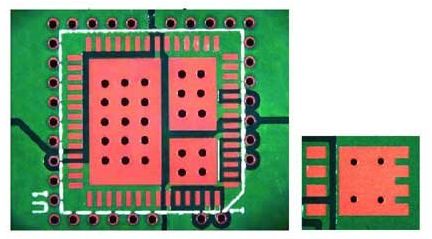 至于版圖布局,金屬較多顯然很有助益。更厚的頂層有助于降低溫度,不過也許對PCB的其余部分并不適合,因為成本增加了,其它元件需要的更精細的間距也不可能實現(xiàn)。更大的銅面積很有用,但又會消耗PCB空間。這些應(yīng)該盡可能由焊料覆蓋,因為金屬表面比涂漆表面的散熱性更好。在多層PCB中,有時利用內(nèi)層來協(xié)助散熱。熱通孔 (填充焊料) 有時可用來把熱量擴散到PCB的另一面去 (圖9)。