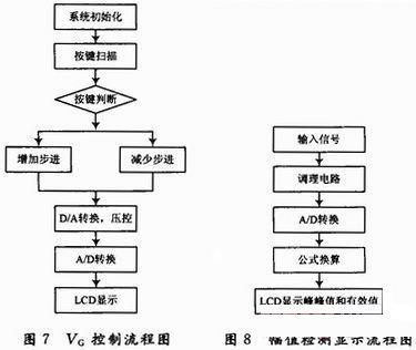 MSP430系列單片機是美國德州儀器(TI)1996年開始推向市場的一種16位超低功耗的混合處理器(Mixed Signal Processor)。由于它具有極低的功耗、豐富的片內(nèi)外設(shè)和方便靈活的開發(fā)手段,已成為眾多單片機系列中一顆耀眼的新星。對于MSP430系列而言,由于引進(jìn)了FLASH型程序存儲器和JTAG技術(shù),不僅使開發(fā)工具變得簡便,而且價格也相對低廉,并且還可以實現(xiàn)在線編程。程序采用C語言開發(fā)。VCA810的VG控制以及輸出電壓幅值檢測、顯示的流程圖如圖7、圖8所示。