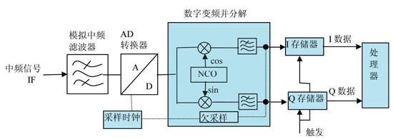 輸入頻譜儀的射頻信號經(jīng)過混頻后變?yōu)橹蓄l信號IF,再經(jīng)過帶通濾波器(中頻濾波器)進(jìn)入A/D轉(zhuǎn)換器。在數(shù)字處理部分,對下變頻為基帶的IQ信號進(jìn)行低通濾波和欠采樣,存儲在內(nèi)存中,準(zhǔn)備進(jìn)一步處理,存儲的數(shù)據(jù)表述IQ信號的電壓值。