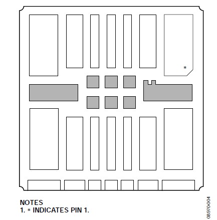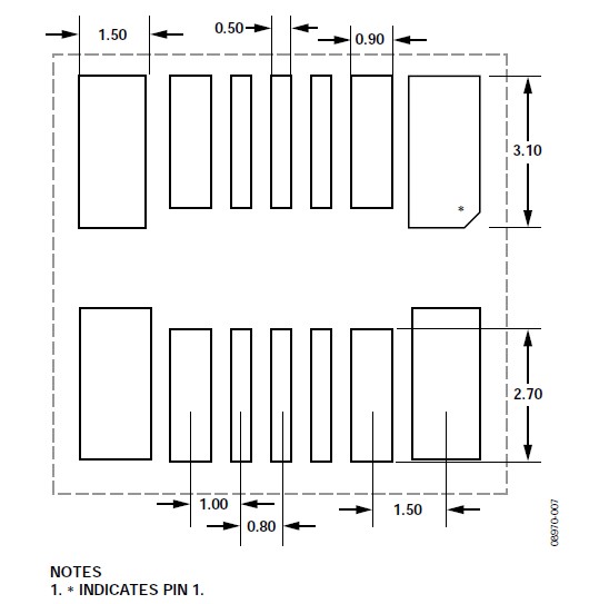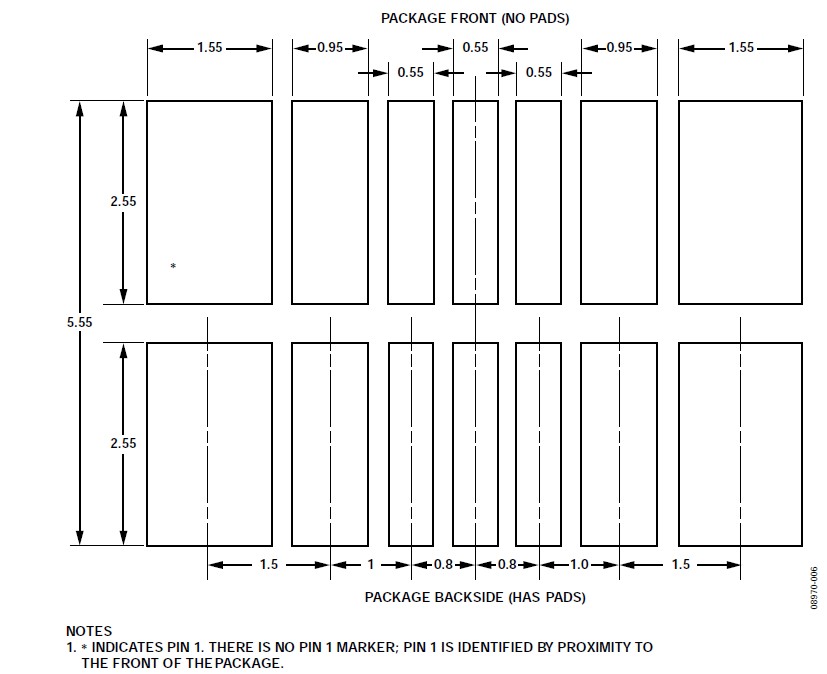 關(guān)于垂直和水平安裝方向的CVMP焊盤布局(焊盤圖形),請參閱本應(yīng)用筆記的"焊盤布局"部分。CVMP背面的焊盤布局如圖7所示。注意,封裝正面上有一些額外的焊盤(見圖4)沒有顯示在焊盤布局中,這些焊盤用作測試點(diǎn),不應(yīng)進(jìn)行電氣連接。