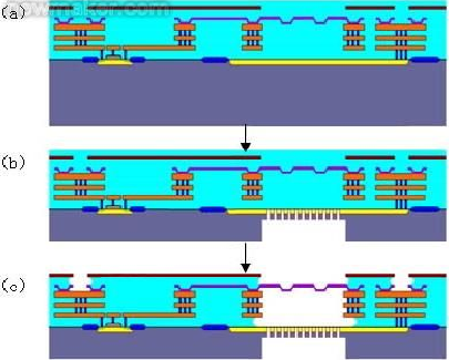 下圖簡述了Post-CMOS MEMS的制造方式。在Post-CMOS MEMS工藝中需特別注意,不能讓額外的熱處理或高溫工藝影響到CMOS組件的物理特性及MEMS的應力狀態(tài),以免影響到振膜的初始應力。鑫創(chuàng)科技公司克服了諸多的技術難題,完全采用標準的CMOS工藝來同時制造電路元件及微機電麥克風結構。在CMOS部分完成后,將芯片的背面研磨至適當厚度以符合封裝要求。最后,利用氫氟酸溶液(HF)去除犧牲氧化物來釋放懸浮結構。此外,在設計中還需考慮可完全去除犧牲材料而又不損害麥克風振膜的蝕刻方法,并應避免麥克風振膜與背電極板之間產(chǎn)生粘黏現(xiàn)象。