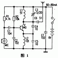 圖1是較為經(jīng)典的1.5km單管調(diào)頻發(fā)射機電路。電路中的關(guān)鍵元件是發(fā)射三極管,多采用D40,D5O,2N3866等。工作電流為60--80mA。但以上三極管難以購到,且價格較高,假貨較多。筆者選用其他三極管實驗,相對易購的三極管C2053和C1970是相當不錯的,實際視距通信距離大于1.5km。筆者也曾將D40管換成普通三極管8050,工作電流有60--80mA,但發(fā)射距離達不到1.5km,若改換成9018等,工作電流更小,發(fā)射距離也更短,電路中除了發(fā)射三極管以外;線圈L1和電容C3的參數(shù)選擇較重要,若選擇不當會不起振或工作頻率超出88--108MHz范圍。其中L1,L2可用0.31mm的漆包線在3.5mm左右的圓棒上單層平繞5匝及10匝,C3選用5-20pF的瓷介或滌綸可調(diào)電容。實際制作時,電容C5可省略,L2上也可換成10-100mH的普通電感線圈。若發(fā)射距離只要幾十米,那么可將電池電壓選擇為1.5-3V,并將D40管換成廉價的9018等,耗電會更少,也可參考《電子報》2000年第8期第五版(簡易遠距離無線調(diào)頻傳聲器)一文后稍作改動。圖1介紹的單管發(fā)射機具有電路簡單,輸出功率大,制作容易的特點,但是不便接高頻電纜將射頻信號送至室外的發(fā)射天線,一般是將0.7--0.9m的拉桿天線直接連在C5上作發(fā)射的,由于多普勒效應(yīng),人在天線附近移動時,頻漂現(xiàn)象很嚴重,使本來收音正常的接收機聲音失真或無聲。若將本發(fā)射機作無線話筒使用,手捏天線時,頻漂有多嚴重就可想而知了。