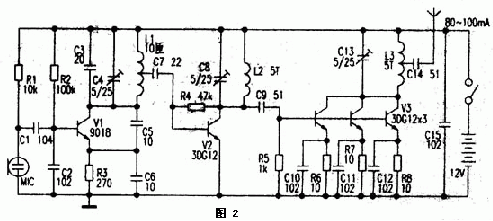 圖2為2km調(diào)頻發(fā)射機電路。本電路分為振蕩、倍頻、功率放大三級。電路中V1、C2--C6、R2、R3及L1組成電容三點式振蕩器,其振蕩頻率主要由C3、C4和L1的參數(shù)決定,其振蕩頻率為44~54MHz,該信號從L1的中心抽頭處輸出,再經(jīng)過C7耦合至V2放大,由C8和L2選出44~54MHz的二倍頻信號,即88-108MHz,,此信號由C9耦合至V3進行功率放大,V3由3只3DGl2三極管并聯(lián)組成,可擴大輸出功率。該電路正常工作時,電流約80-100mA。組成V3的三只3DG12可加上適當?shù)纳崞苑肋^熱。制作時L1~L3用0.31mm漆包線在直徑3.5mm圓棒上單層平繞。