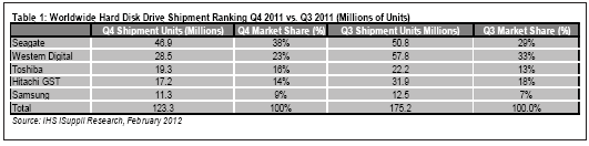 據(jù)IHS iSuppli公司的存儲(chǔ)市場(chǎng)簡(jiǎn)報(bào),2011年第四季度希捷重新奪回硬盤(HDD)出貨量的第一排名。此前七個(gè)季度西部數(shù)據(jù)一直保持第一,但去年的泰國(guó)洪災(zāi)令其損失慘重。