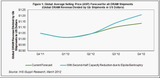 如果爾必達(dá)的產(chǎn)能減少逾25%,則到2012年底,所有DRAM出貨量的全球平均銷售價(jià)格(ASP)預(yù)計(jì)上升到1.21美元,比上半年末的1.05美元上漲15.5%,如圖1所示。如果不是破產(chǎn)導(dǎo)致產(chǎn)能大減,今年底價(jià)格將上升到1.13美元,只比上半年末的水平高出8.5%。