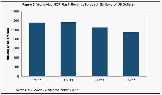 據(jù)IHS iSuppli公司的移動市場存儲報告,由于經(jīng)濟形勢糟糕和泰國洪災(zāi)導(dǎo)致PC出貨量下降,2011年第四季度NOR閃存營業(yè)收入環(huán)比下降9%。
