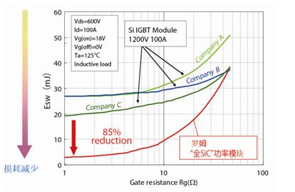 內(nèi)置了最先進(jìn)的SiC-SBD與SiC-MOSFET的“全SiC”模塊,與傳統(tǒng)的Si-IGBT相比,開(kāi)關(guān)損耗可降低85%。