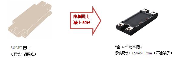 - 與傳統(tǒng)的400A級(jí)別的Si-IGBT模塊相替換時(shí),體積減小約50%