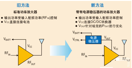 使用DC-DC轉(zhuǎn)換器(功率放大器電源穩(wěn)壓器)的主要目的是減少分母中的Pdc因子。當(dāng)功率放大器與電池直接相連時(shí),Pdc=Vbatt*Ibatt,而當(dāng)它使用功率放大器電源穩(wěn)壓器供電時(shí),Pdc=V o*I o?,F(xiàn)在我們能夠看出,為了增加PAE,V o和Io 必須低于Vbatt和Ibatt。這可以通過降低發(fā)射的射頻功率電平,降低功率放大器電源穩(wěn)壓器的輸出電壓來實(shí)現(xiàn)。這樣也降低了Io (功率放大器的吸收電流),并且由于DC-DC轉(zhuǎn)換器的高效性,電池的輸出電流也會(huì)降低?! ?br />