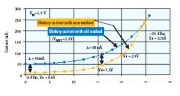 圖3:當(dāng)功率放大器使用DC-DC轉(zhuǎn)換器供電時(shí),電池電流的節(jié)省情況