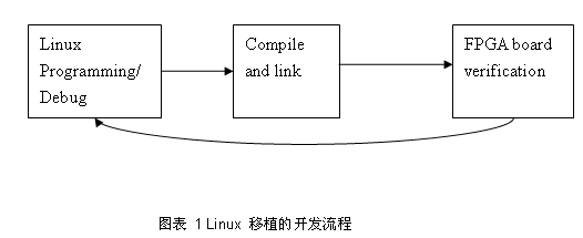 使用者開始進(jìn)行Linux移植到晶心平臺,首先須先選定一版晶心的Linux原始碼作為基準(zhǔn)再進(jìn)行軟件移植,修改原始碼以符合使用者的開發(fā)平臺,經(jīng)由工具鏈的compile與link所產(chǎn)生的Linux的映像文件,再放到FPGA板上以驗(yàn)證程序編寫的正確與否,依此開發(fā)程序:軟件編寫->FPGA板驗(yàn)證,再回到軟件編寫程序直到所有周邊IP在FPGA板上驗(yàn)證完全,Linux 移植才完成,如圖表 1所示,Linux移植過程中,AICE調(diào)試可以有效加快Linux移植的速度。