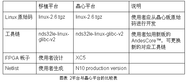移植平臺是指使用者要移植Linux的平臺,也就是移植Linux的目標(biāo)平臺。將移植平臺與晶心平臺的比較列表如下: (其中所列之軟件皆屬于BSP310中之套件)。