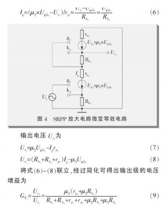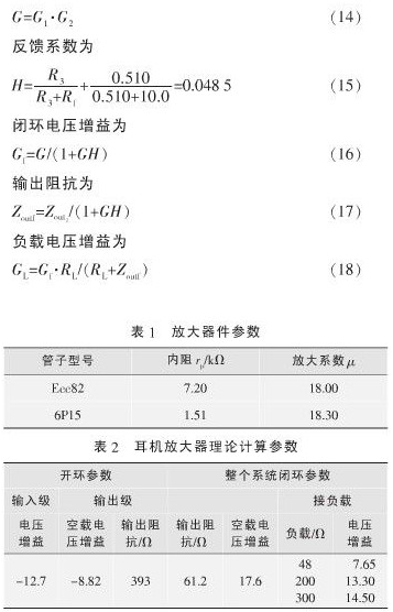 輸入級放大器件選用Ecc82雙三極管,輸出級選用6P15,基本參數(shù)如表1所示。為降低輸出阻抗,以便于和阻抗較低的耳機(jī)相匹配,輸出級SRPP電路采用雙管并聯(lián)的方式工作。放大器的相關(guān)參數(shù)計算方法如下所示,其中開環(huán)電壓增益為: