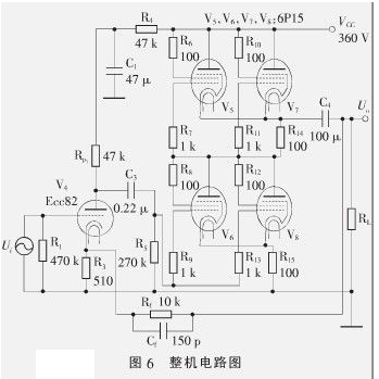 輸出級采用SRPP電路,電子管既可選擇內(nèi)阻合適的三極管,如6N6,E182CC,也可選擇用于功放的小功率五極管,如6P15,6P14,EL42,EL91,EL84,EL86。