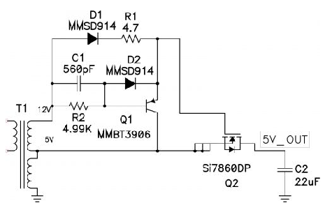 圖 4 顯示的是用于控制同步反向拓?fù)渲?Q2 傳導(dǎo)的分立器件。該電路可以讓您控制開啟柵極電流并保護(hù)整流器柵極免受高反向電壓的損壞。該電路可以用變壓器輸出端的負(fù)電壓進(jìn)行驅(qū)動。12V 輸入與 5V 輸出相比負(fù)電壓值很大,從而引起 Q1 傳導(dǎo)并短路電源 FET Q2 上的柵-源電壓,迅速將其關(guān)閉。由于基極電流流經(jīng) R2,因此在加速電容 C1 上就有了一個負(fù)電壓。在此期間,一次側(cè) FET 將會發(fā)生傳導(dǎo)并在變壓器磁化電感中存儲能量。一次側(cè) FET 關(guān)閉時,變壓器輸出電壓在正電壓范圍擺動。Q2 柵-源通過 D1 和 R1 被迅速前向偏置。C1 放電時,D2 對 Q1 基極-發(fā)射極連接進(jìn)行保護(hù)。在一次側(cè) FET 再次開啟之前,該電路會一直保持這種狀態(tài)。正如同步降壓轉(zhuǎn)換器那樣,輸出電流會真正地對輸出電容進(jìn)行放電。開啟一次側(cè) FET 會衰減變壓器二次側(cè)上的電壓并去除 Q2 的正驅(qū)動。這種轉(zhuǎn)換會導(dǎo)致明顯的貫通疊加一次側(cè) FET 和 Q2 傳導(dǎo)次數(shù)。為了最小化該次數(shù),當(dāng)一次側(cè)和二次側(cè) FET 均開啟時,Q1 將會盡快地短路同步整流器上的柵-源。