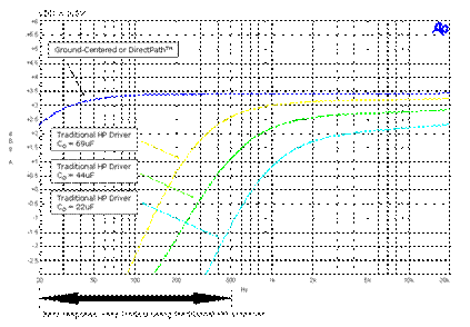 對于 100Hz 的截止頻率及 16Ω 的耳機喇叭阻抗,電容必須是 110μF。對于需要小體積尺寸的情況而言,這會造成電容值及實體尺寸過大,而且使得成本過高。許多工程人員只能改用 22μF 的較小電容,不過這會影響耳機的低頻率傳真度,而導致低音響應(yīng)不佳。