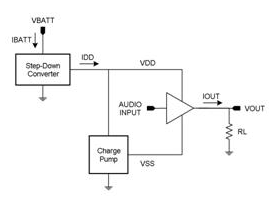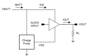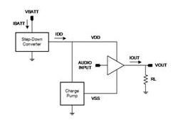 其中的技巧是設(shè)計將電池電壓降低至較低電壓的放大器,并使用適應(yīng)性電源軌 (分別有負電源軌) 降低播放音樂時整個輸出 FET 的電壓降幅。其中一種實現(xiàn)這類放大器的方式是,使用電荷泵作為圖 8 所示的步降區(qū)塊。某些工程人員偏好這類做法,原因在于步降電荷泵僅需要相對較小的飛馳電容(flying capacitor) (1μF 至 2.2μF),而這也是相對較小的組件