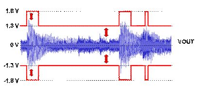 G 類放大器一般使用多個電源電壓,以發(fā)揮比 AB 類放大器更高的效率。在本例中,TI 最新的 G 類 DirectPath 放大器 (TPA6140A2) 首先將電池電壓降低至較低的電壓值,然后切換至低信號強度的低供應(yīng)電壓 (1.3V),并且只有在信號強度超出該低電源電壓軌時,才切換至較高的電源電壓 (1.8V)。這些適應(yīng)性電源電壓軌的升降速度高于音頻,因此可避免失真或削波。此外,由于一般聆聽的音頻低于 200mVRMS,因此電源電壓通常是最低值 (亦即 1.3V),并且提供優(yōu)于上述 AB 類放大器的效率。在音頻的無噪聲階段期間,整個電源軌的電壓會降低,而且信號相當小。當音頻變得大聲時,放大器會切換至較高的電源軌,然后切換回較低的電源軌,導致整個輸出 FET 的電壓降幅縮小。圖 7 的紅色箭頭表示此電壓降幅。
