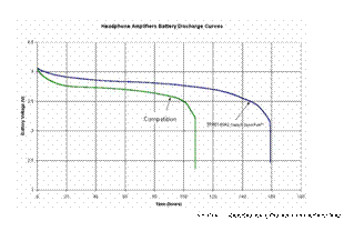 下圖的 Y 軸表示電池電壓,X 軸表示時間。綠線表示一般的接地置中耳機放大器,藍線表示 G 類耳機放大器。